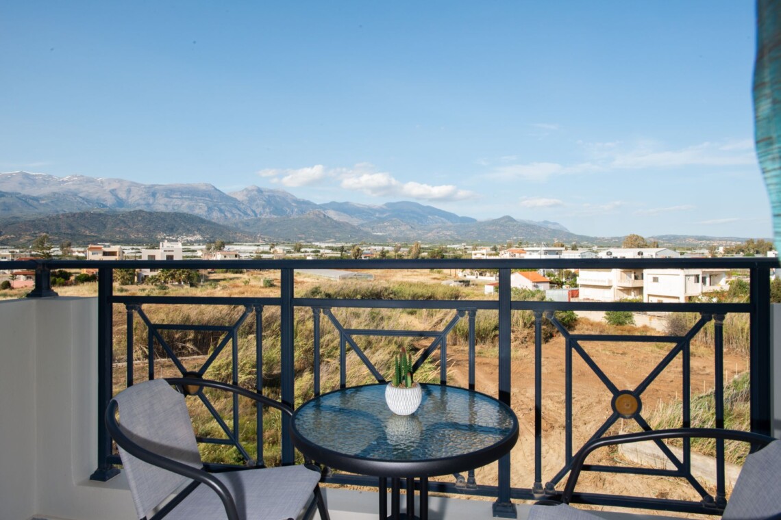 The bedroom features a comfortable double bed and opens onto a private balcony with a beautiful mountain view — perfect for enjoying your morning coffee in a tranquil setting.