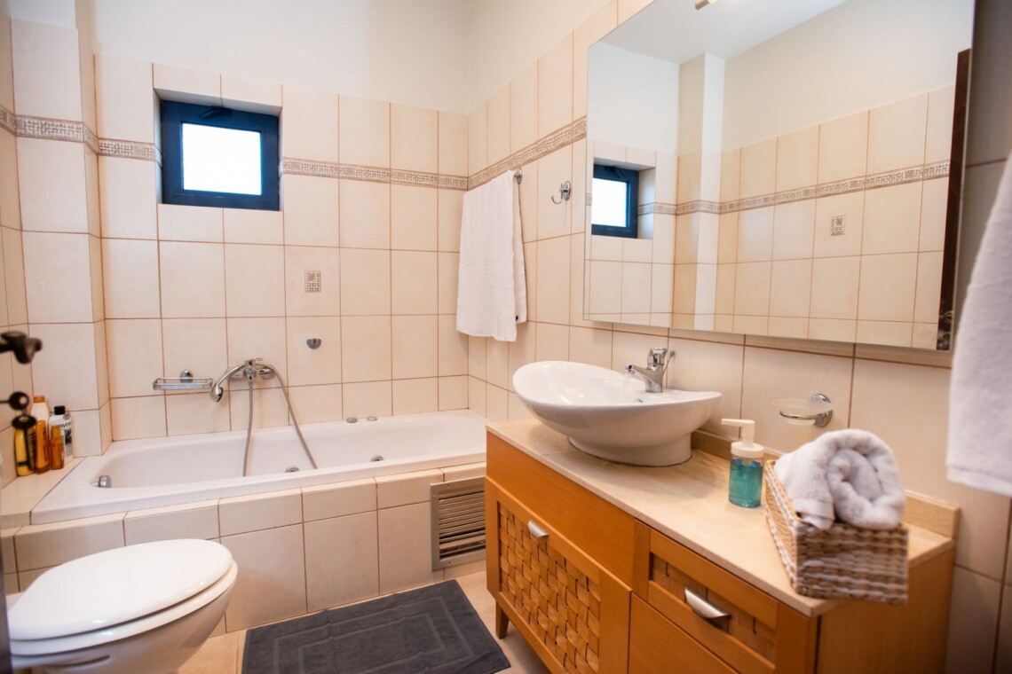 A spacious bathroom with a bathtub offers a relaxing space to unwind.