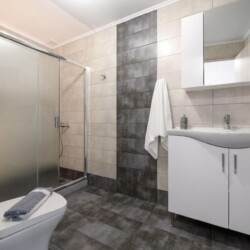 The modern sizeable bathroom is at the other side of the corridor. It is a great bathroom with shower, toilet and wash basin. A washing machine is available in the storage room.