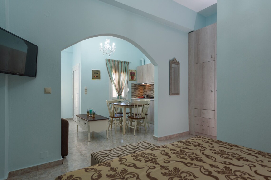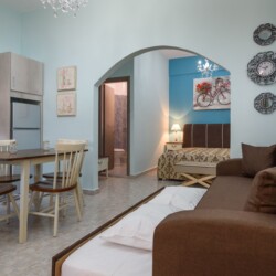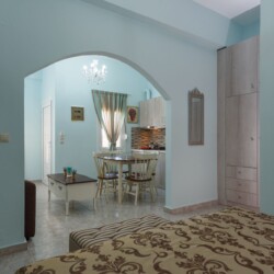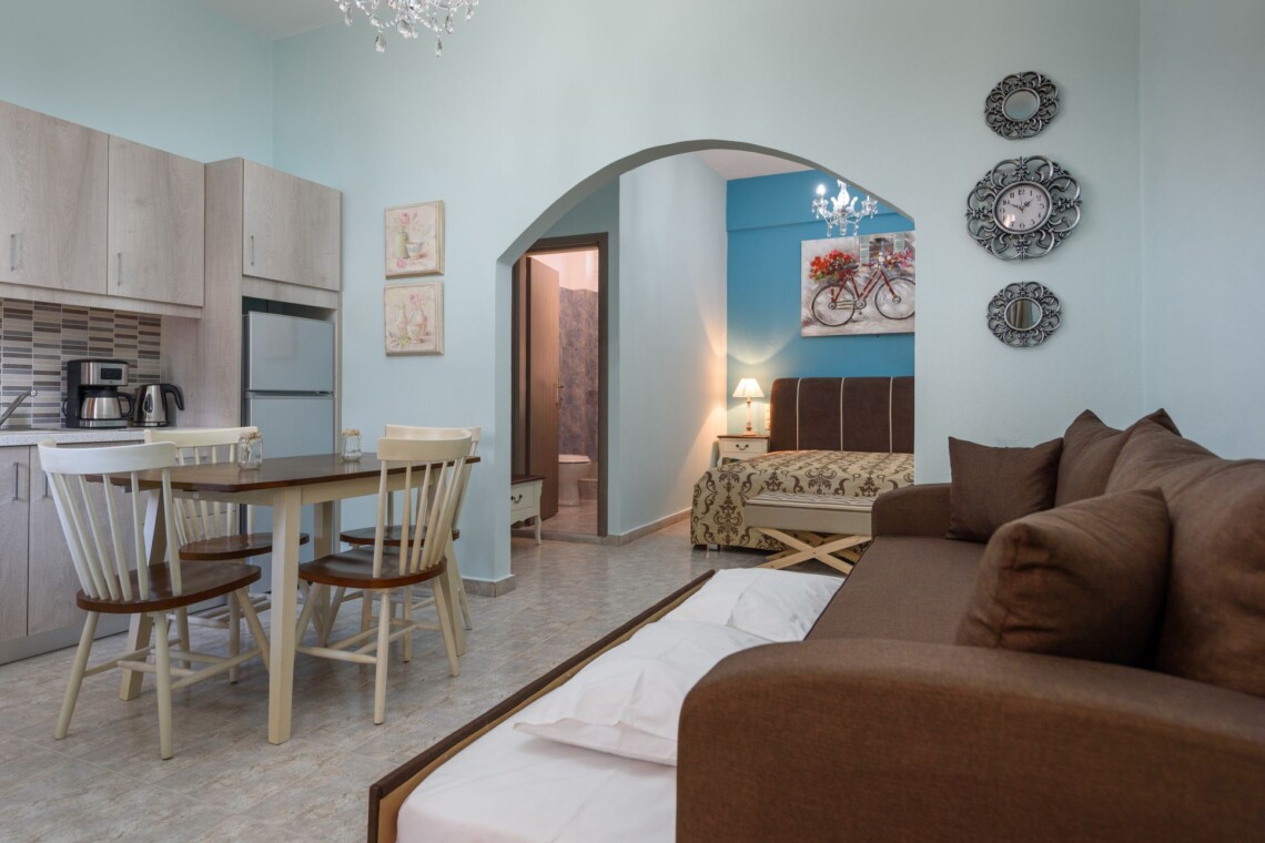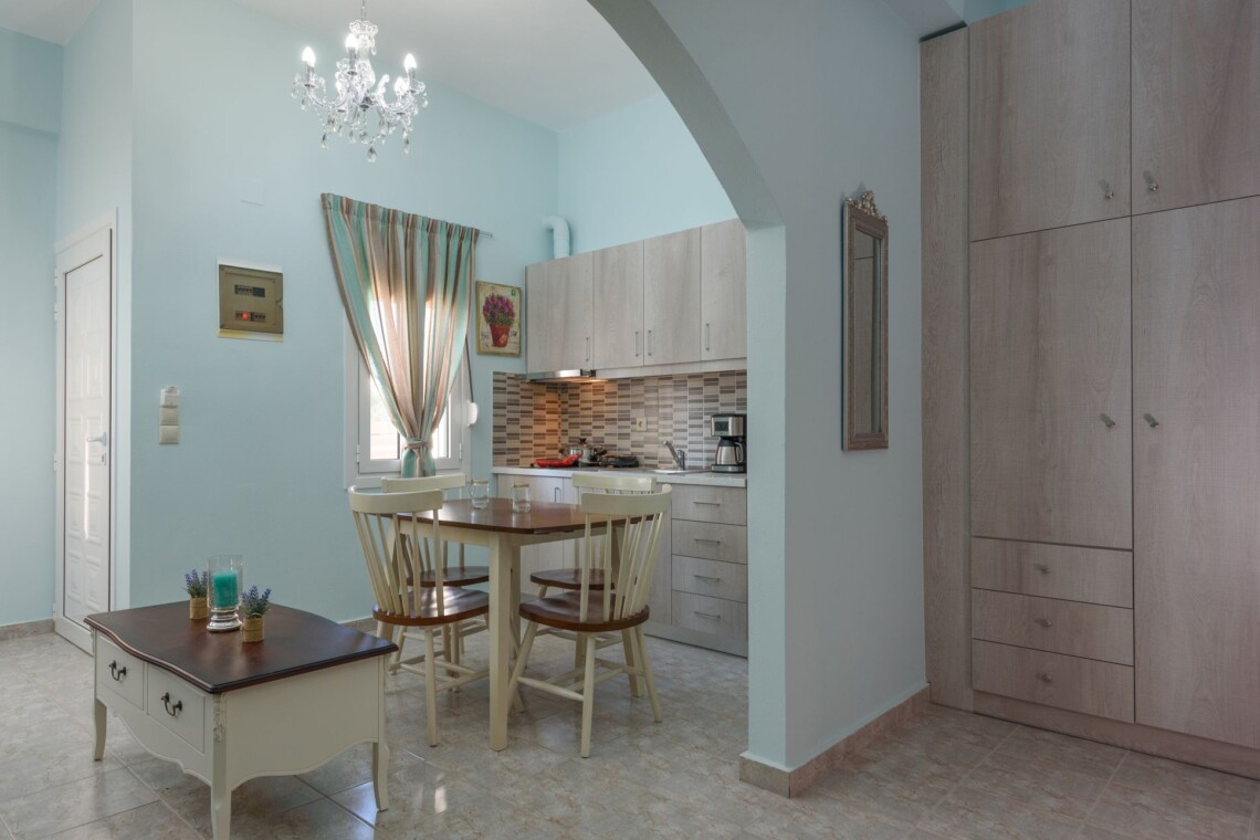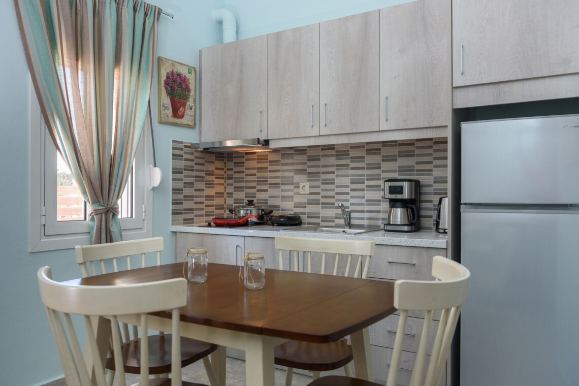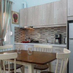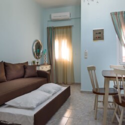 They are all beautifully decorated with handmade furniture, crafted in the Cretan traditional style mixed with modern elements. All apartments come with a fully equipped kitchen with microwave, refrigerator, coffee maker as well as necessary kitchen utensils. Each one has his own private bathroom with shower, hair dryer, towels and washing machine. There is Wi-Fi coverage in each apartment. The individually controlled air conditioning and the smart TV are in the living area.