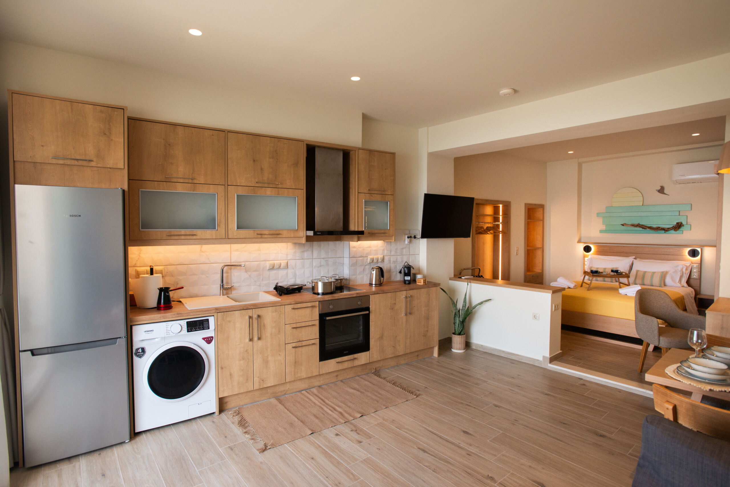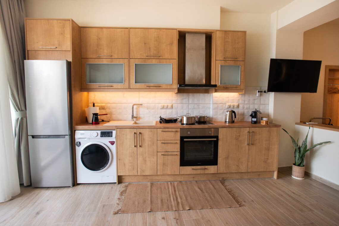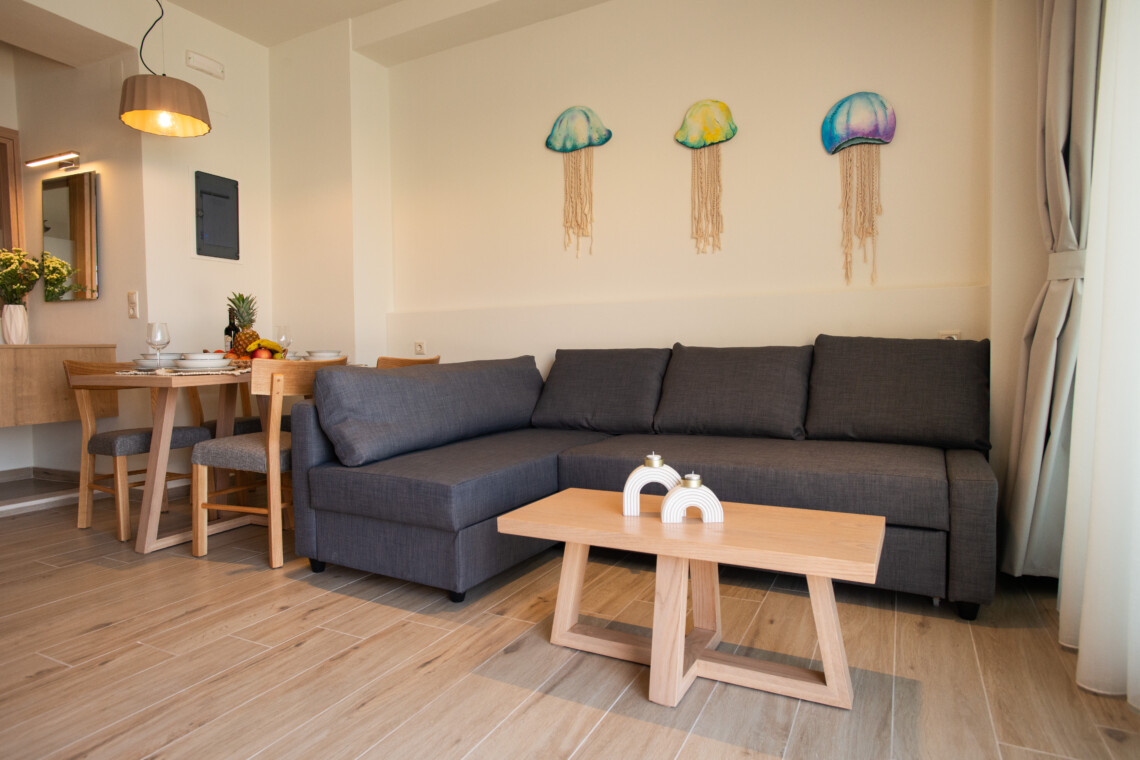The inviting double bed faces the sea, allowing you to wake up to the soothing sound of the waves. A comfortable couch provides extra sleeping space for two children, making it an ideal escape for couples or small families. The fully equipped kitchen offers everything you need to prepare meals, while the modern bathroom, featuring sleek finishes, adds a touch of luxury to your stay.