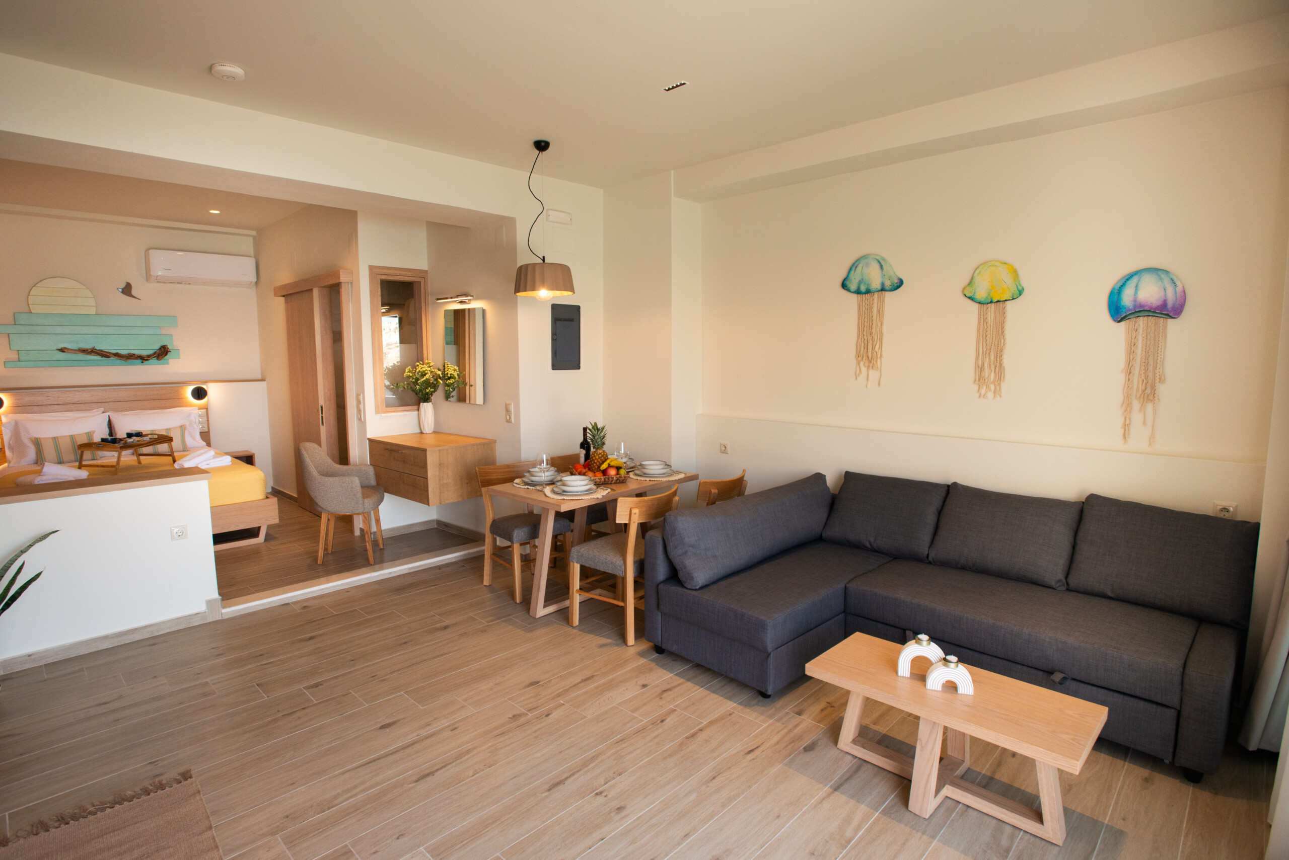 Step into Studio Meltemi, a tranquil beachfront retreat in the heart of Matala, where the colors of the sea blend seamlessly with the warm, earthy tones of the interior. This elegant studio is designed with soft beige, natural wood accents, and deep blue details that mirror the mesmerizing views of the Mediterranean just outside your window. The space is bathed in natural light, enhanced by dark shadings that perfectly balance brightness and privacy.