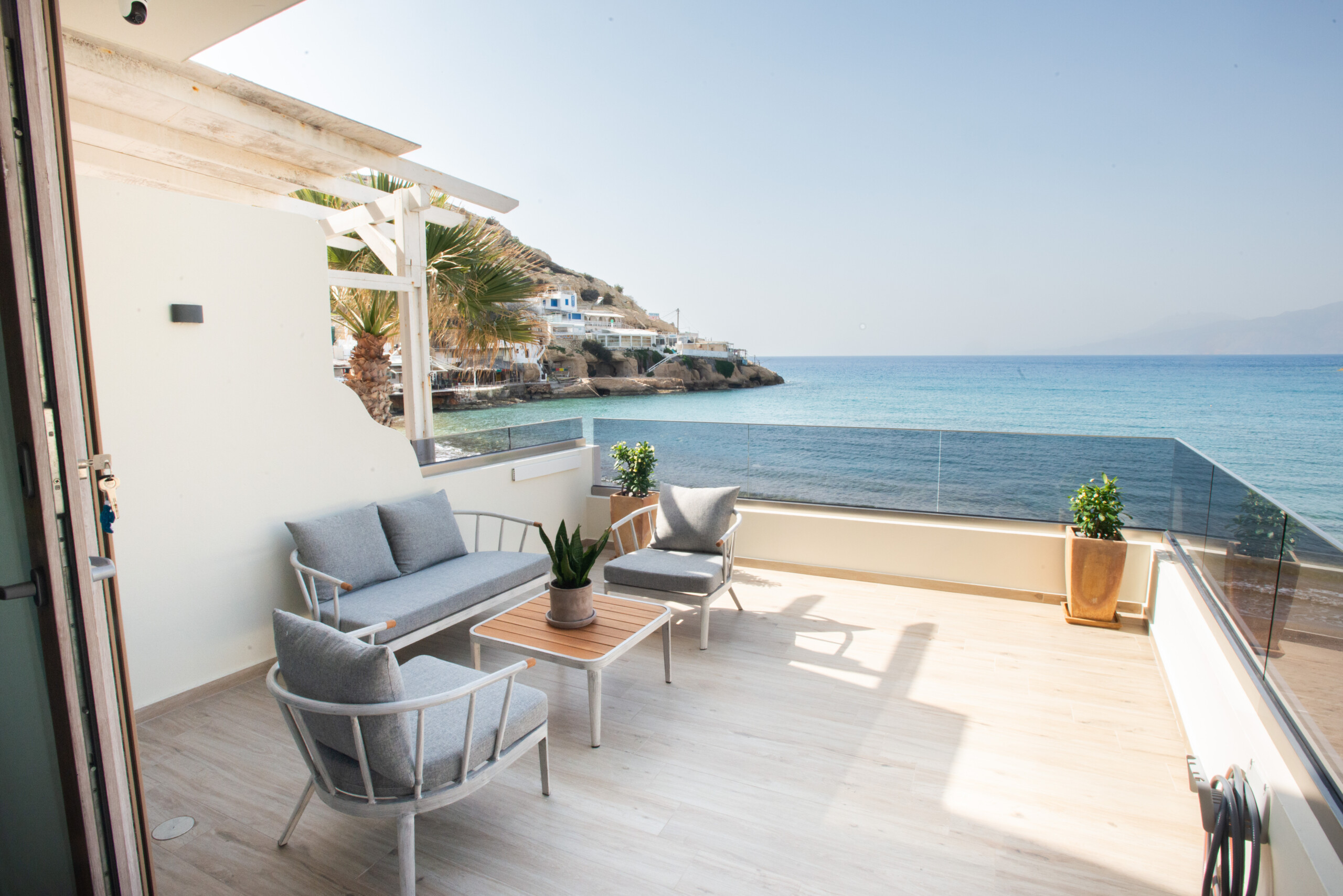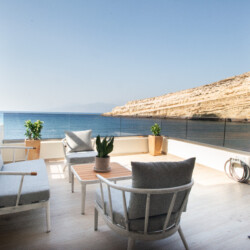 Step onto the private balcony, where the salty breeze and breathtaking views of the endless blue create an atmosphere of pure relaxation. Whether you’re enjoying a quiet morning coffee or unwinding in the evening with a glass of wine, Studio Meltemi promises an unforgettable experience in one of Crete’s most iconic coastal destinations.