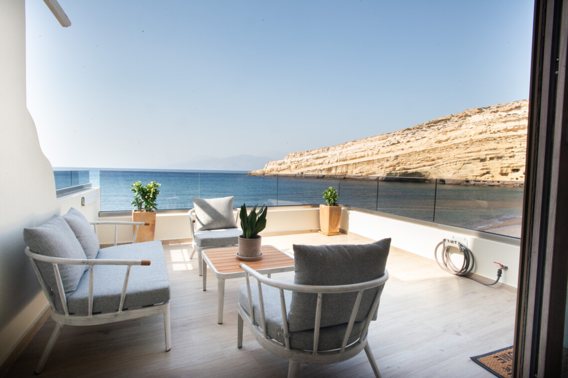 Wake up to the sound of the waves in this beautiful beachfront studio in Matala. Perfect for couples or small families, Studio Meltemi offers a stunning sea view from inside and from the private balcony.