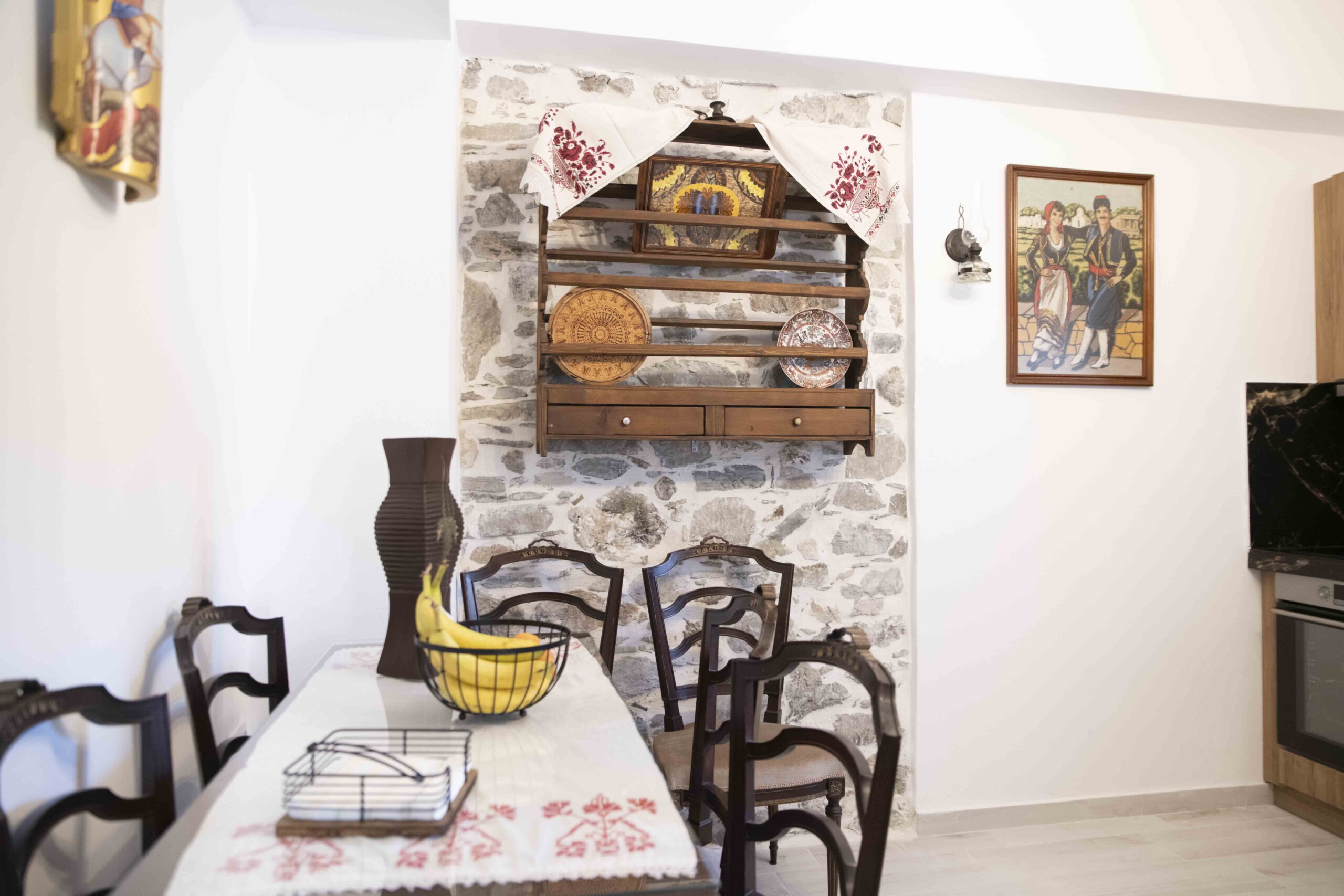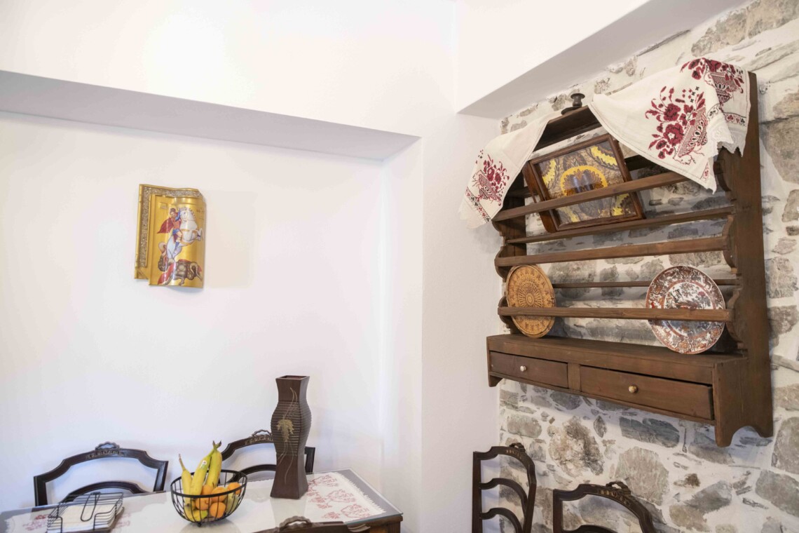 The living area, located at the entrance, is a delightful space furnished with lovely Cretan-Greek-styled furniture, creating an inviting atmosphere for you to unwind. Here, you can enjoy entertainment on the TV equipped with ASTRA.